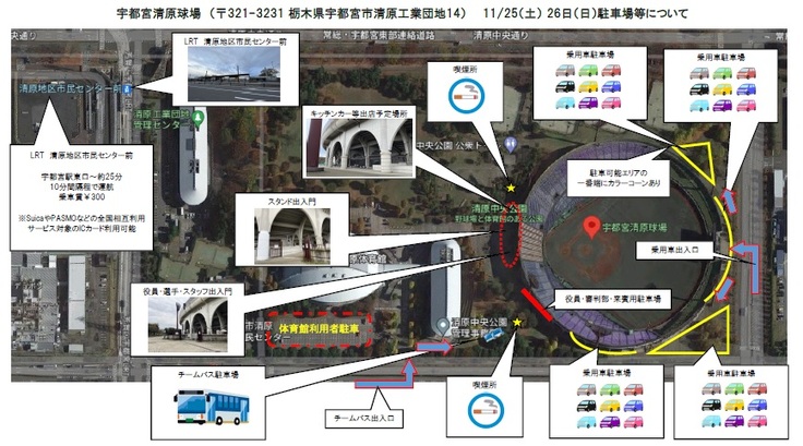 お車でお越しの場合はGoogleマップやYahooナビ等で「宇都宮清原球場」もしくは「清原球場」で検索して頂ければヒットします。
