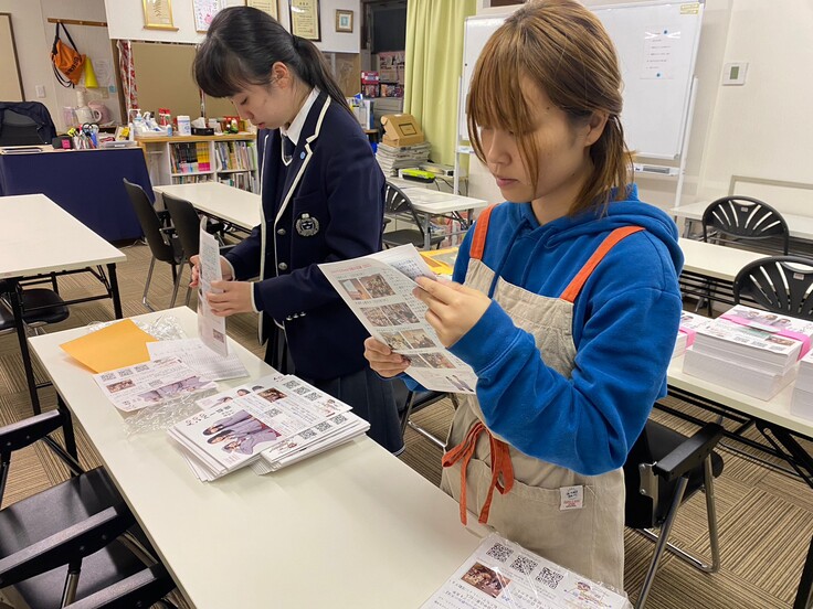 今回のチラシの印刷代、自分たちが土曜夜市など商店街でのイベントに出店して売り上げた中から支払っています。中高生自ら稼いだ大切なお金を使ってのチラシ、1枚1枚丁寧に仕分けしています。