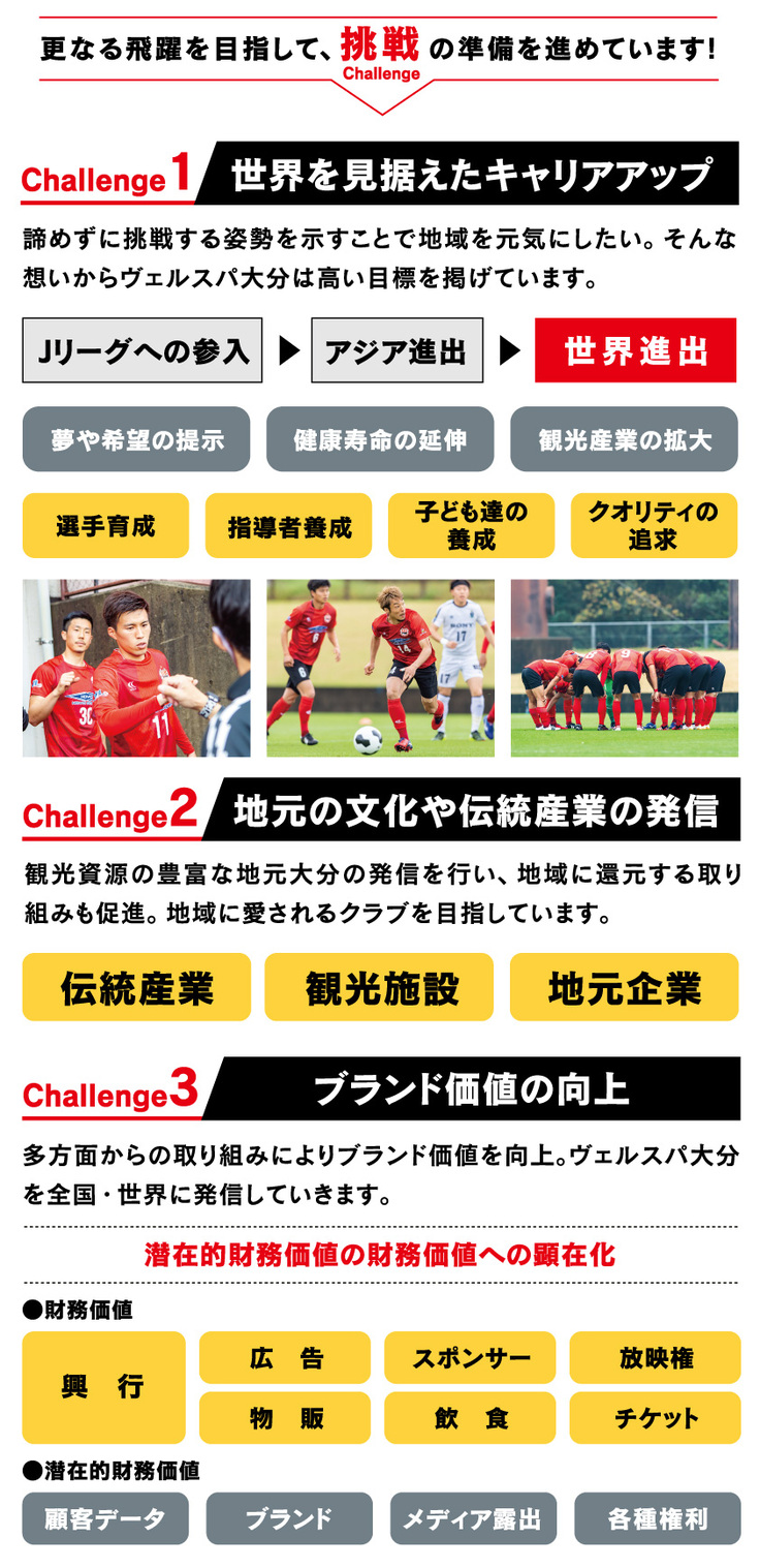 J3昇格に向けて、また、J3昇格後もさらなる成長を遂げていくために、クラブの強化プロジェクトとしてこのたび、クラウドファンディングを実施することに決めました。ファンやサポーターの皆様と一緒に、ヴェルスパ大分をより強いクラブにしていけたらと思っております。