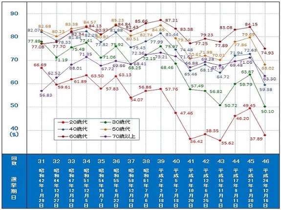 衆議院選挙 年代別の投票率推移です。(引用:公益財団法人 明るい選挙推進協会)