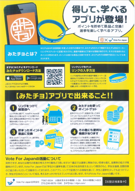 「みたチョ」を使って、リングの『Vote For Japan』のロゴをかざすと、選挙や世の中に対する学生の声や、選挙告知動画などの選挙啓発動画をはじめ、さらには、スポンサー広告やゲームが流れる仕組みになっています。ユーザーがその動画を見るとポイントが貯蓄されていき、そのポイントを商品券やタブレットと交換することができる仕組みになっております。また、ARリングは、Vote For Japan加盟店(Vote For Japanプロジェクトに賛同いただいているリング代金のスポンサー様)で提示すると割引を受けられるクーポンにもなります。このARアプリ『みたチョ』を大学生協様のご協力のもと、教科書販売時や食堂などで配布します。また、食堂など生協様の敷地内において、ポスターを設置していただくなど、周知活動にもご協力いただきます。その他、校門前などでも手配り配布や加盟店様での配布も実施していく予定です。