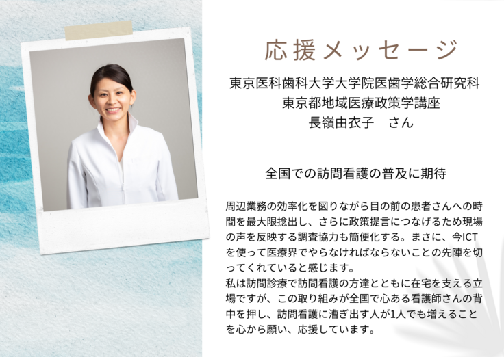 東京医科歯科大学大学院医歯学総合研究科 東京都地域医療政策学講座 長嶺由衣子さんより、本プロジェクトへの応援メッセージをお寄せいただきましたので、ご紹介いたします。