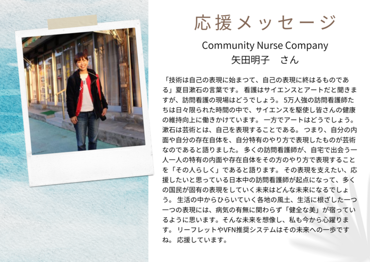 Community Nurse Company 矢田明子さんより、本プロジェクトへの応援メッセージをお寄せいただきましたので、ご紹介いたします。