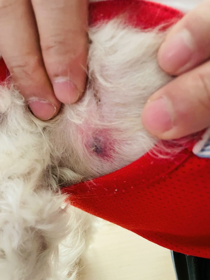 本日、縫合糸反応性肉芽腫(手術で使った糸に体が反応してできるしこり)の疑いがあり、動物病院で診察を受けました。