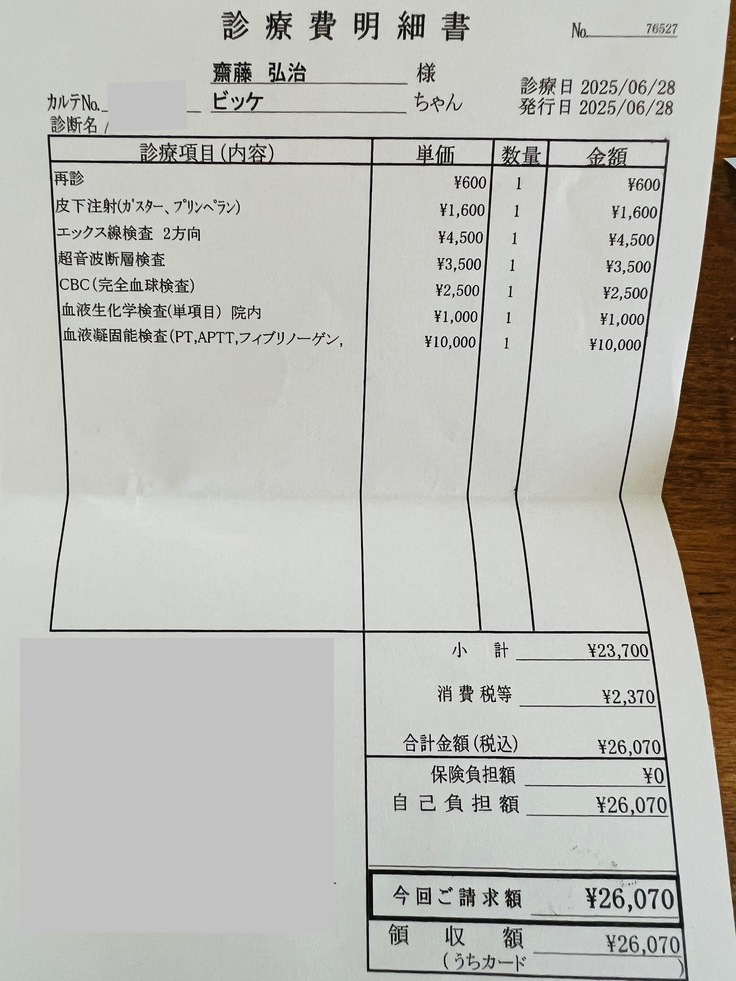 しかし、安心したのも束の間、6月28日(土)にビッケが散歩から帰宅後、痙攣発作を起こし、嘔吐してしまいました。