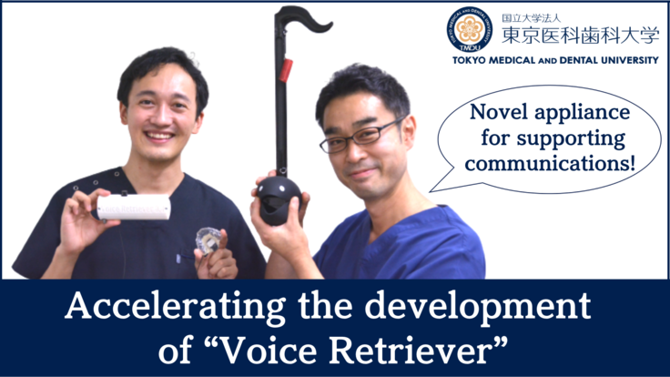 Now, let me introduce the main subject, "Voice Retriever." Although it is not possible to retrieve the ability to make sound from vocal cords, we are developing and improving the equipment with the ability to speak.