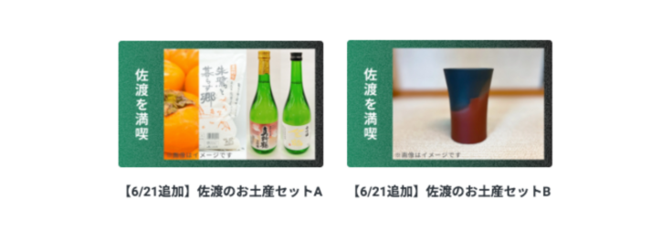 更に、ご自宅にいながら佐渡の魅力をお楽しみいただける「佐渡のお土産セット」も、6/21から追加でご用意しました。「今回どうしても当日会場にはいけないけれど…」「サテライト公演はちょっとハードルが高いけど…」という方も、ぜひクラウドファンディングのリターンを通して音楽会にご参画いただければ幸いです。