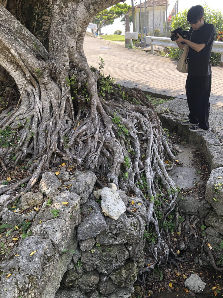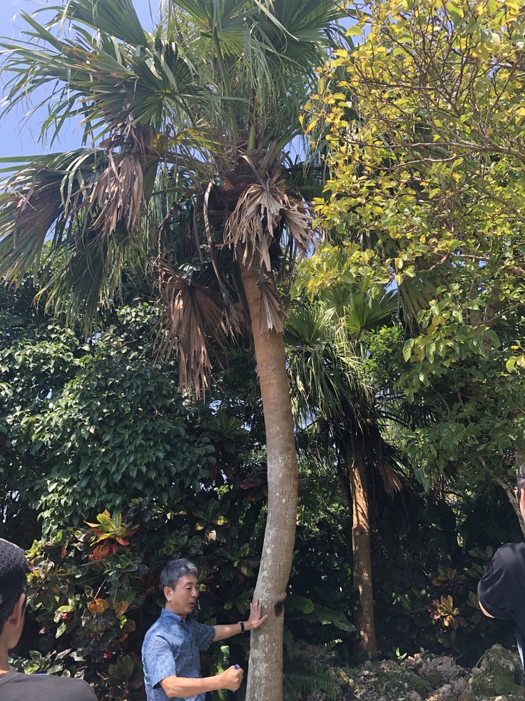 茂木さんとクバの木。クバの木を見つけると突然、「クバは沖縄にとって…」と解説が始まります。