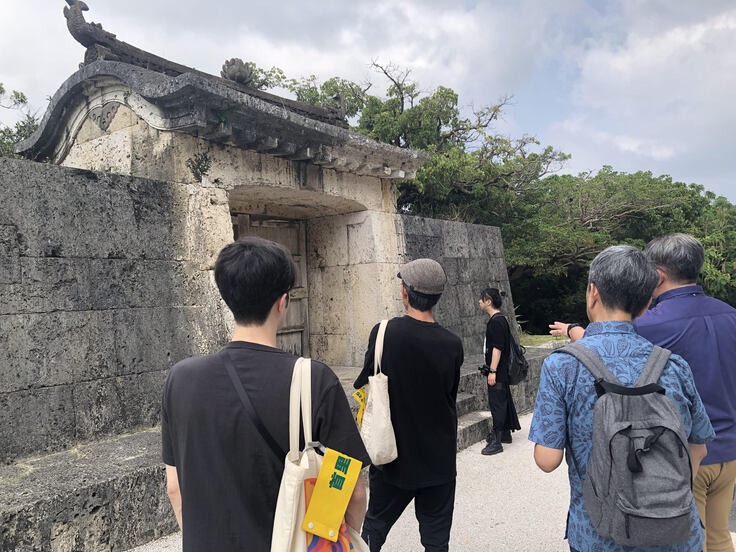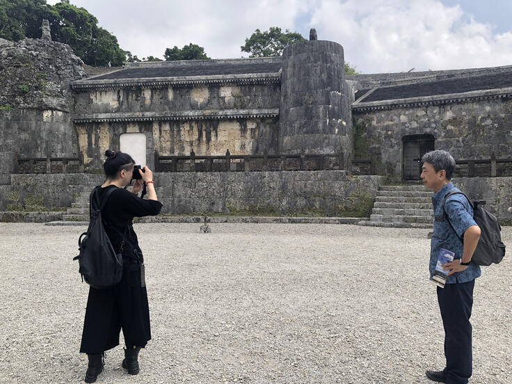 1501年に築かれ、その後、第二尚氏王統の陵墓となった国宝建造物。洗骨の風習、建造物についてなどのお話も伺いました。写真を撮る落合と見守る茂木さん。