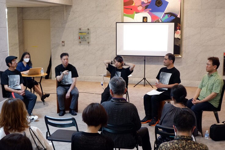 写真は7/3の模様。この日届いたばかりのサンプルを着用してのトークイベントです。実はこのデザイン、落合のリクエストで、少し「耳で聴かない音楽会」に帰納しています…。