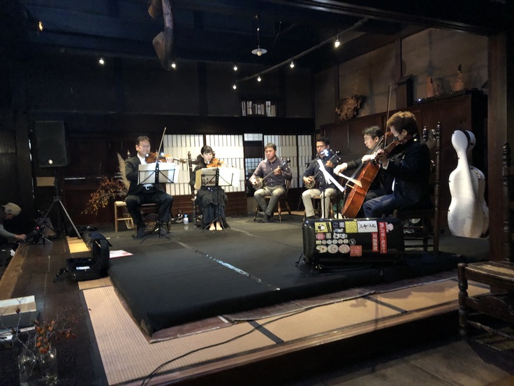 写真からはわかりませんが、落合さんの映像演出は天井の展示を活用して行われました。国の重要文化財に指定されている日下部民藝館、落合陽一展、そしてOpen Leaves。一期一会の演奏会になりました。
