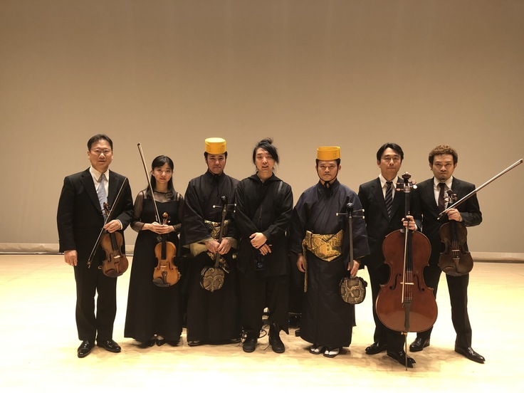 田野倉雅秋(日本フィルソロ・コンサートマスター)、末廣紗弓(ヴァイオリン)、新垣俊道(歌三線)、落合陽一、大城貴幸(歌三線)、門脇大樹(日本フィルソロ・チェロ)、小中澤基道(ヴィオラ)の皆さん。ハードでしたが本当に充実したツアーでした!