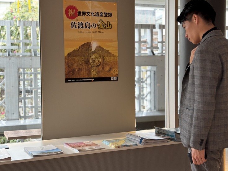 開演前には、 鬼太鼓など佐渡の文化をこ紹介する展示コーナーにて、 来場者の皆様が興味津々にご覧になる姿も。 公演への期待が高まります。