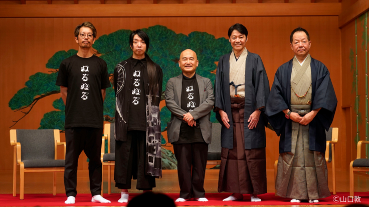 落合ほか6名の主要関係者が登壇して、記者懇談会スタート。音楽会のTシャツと能舞台の組み合わせが目を引きました!クラウドファンディングのリターンでもある 「#ぬるT」の初披露となりました。