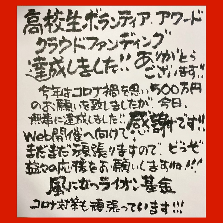 風に立つライオン基金設立者のさだまさしより、当財団を代表いたしまして、目標金額達成の御礼を申し上げます。是非ご覧くださいませ。