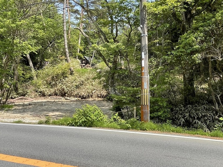 現在、県道側からは写真のように、切り立った崖になっていて、途中に川もあって、こちらからヴォーリズ六甲山荘に行くことはできません。ここに入口と駐車場、それにカフェetc.を作れば、大勢の皆さまをお迎えできるのではないか、こうした考えから検討がスタートしたのでした。