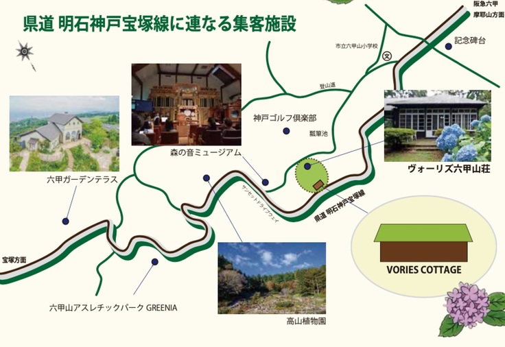 六甲山上の幹線道路「県道明石神戸宝塚線」には、いくつもの観光集客施設が連なっています。東から来れば、六甲ガーデンテラス~アスレチックパークGREENIA~高山植物園~森の音ミュージアム。その次に来るのが、ヴォーリズ六甲山荘ということになります(新たに県道側に入口を設ければ)。
