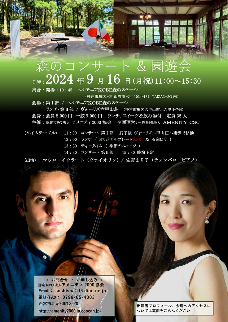 9月16日(月祝)には、同じく六甲山上にある「ハルモニアKOBE森のステージ」とのコラボレーションの企画で、素敵なコンサートとランチ&スイーツを楽しむ「森のコンサート&園遊会」を開催します。