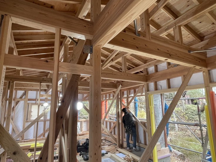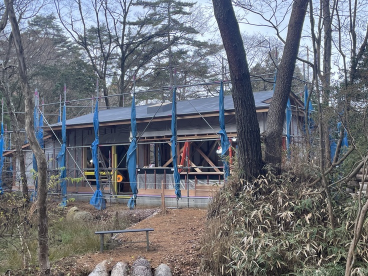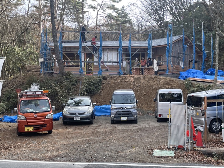 先日の上棟から工事はどんどんと進み、屋根が掛かって建物の雰囲気がずいぶん分かるようになってきました。屋根の黒く見えているところが草屋根になります。