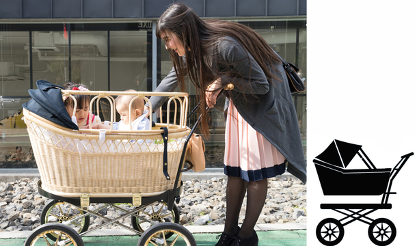 乳母車のイメージを一新する高級ヌメ革の味わいがベビー用品のイメージを一新します。天然素材の籐バスケットの可愛い懐かしさと、子ども2人を乗せてもビクともしない頑丈な構造のベビーカーになりました。