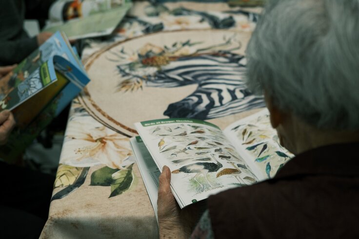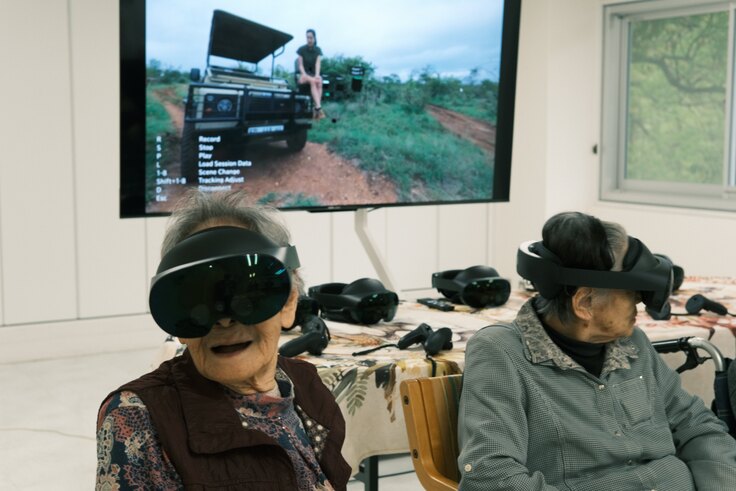 VRヘッドセットを装着する前に、ガイドブックを手に取る高齢者の方々です