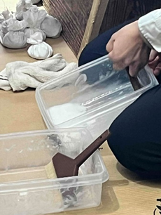 天井の端の部分には唐紙をきっちりはめ込むように用具を使って押し込みます。