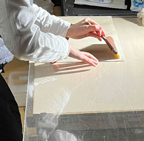 紙全体には薄い糊を、端の部分には接着力が強くなるよう濃い糊を用いて