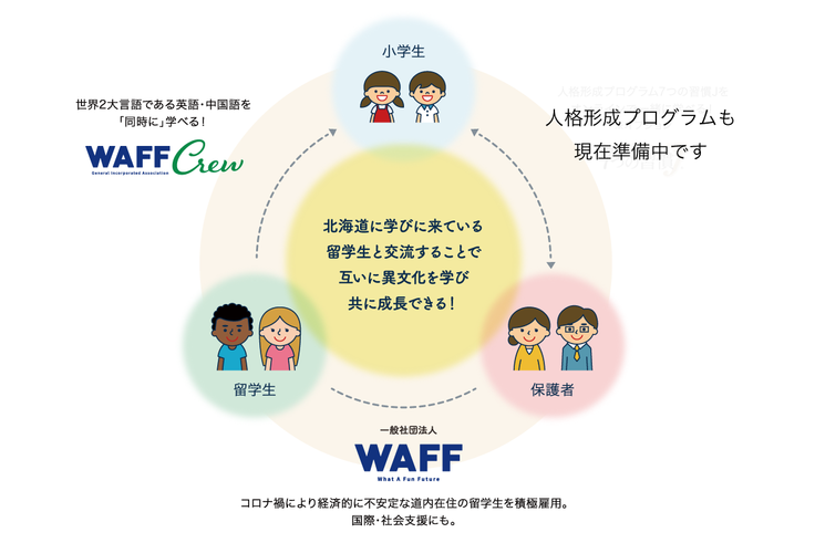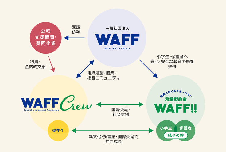 一般社団法人WAFFが塾や教室に行きにくい学童に向けて「言語学習教室」と「国際交流」の場となる車を使った移動教室を運営。運営スタッフはWAFF crewに登録する大学在籍の外国人留学生。コロナ禍の影響により生活が困窮している留学生の支援と異文化交流を行うWAFF crewを運営。