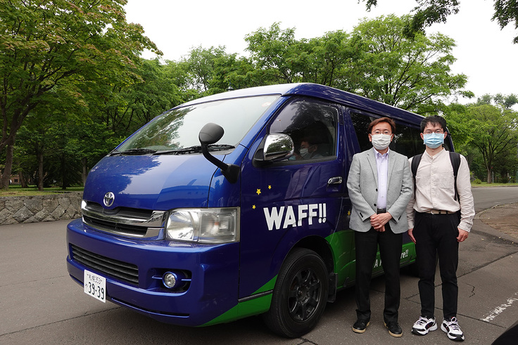代表 かばもと とヒョウくんと、WAFF号を前に。(2021年7月)