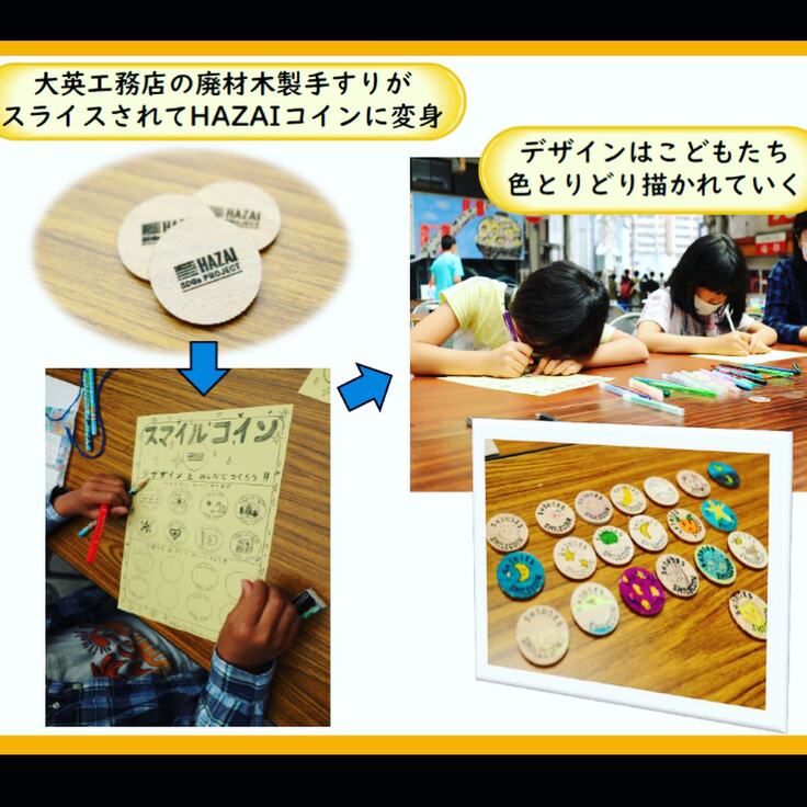 写真は大英産業さんのご寄贈&ご協力のもと、手すりの端材を利用しみんなで作った通貨。