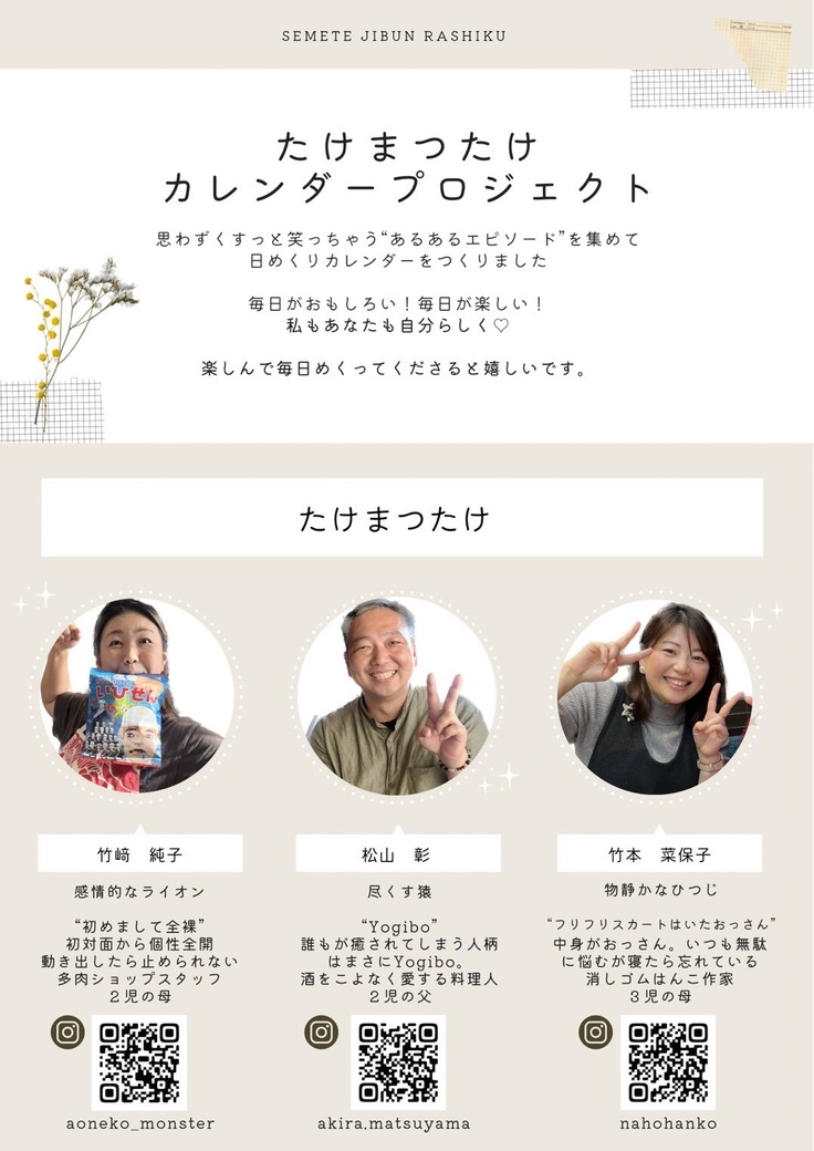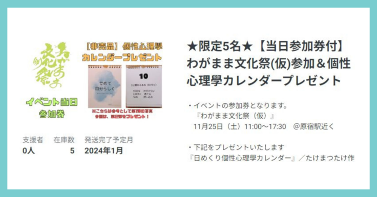 わがまま文化祭(仮)主催メンバーとしてお声掛けした3名。都合により運営参加はできないが、できることがあればと応援してくださっています。 毎日が楽しくなる「日めくり個性心理學カレンダー」を自主製作。大好評につき作成した第2弾を、主催メンバーの方からお願いで、リターンとしてプレゼントさせていただくことになりました!