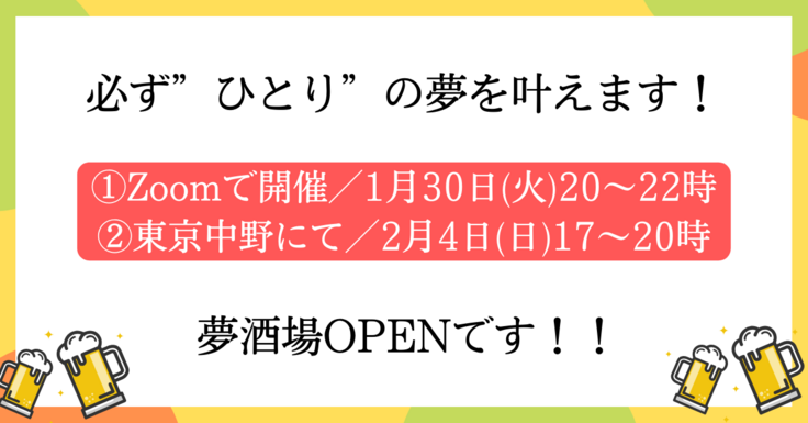 この”夢酒場”では、参加してくださった方の中から1名選び、その方が抱く”ひとつの夢”を覚えるだけでなく、叶えていきます!