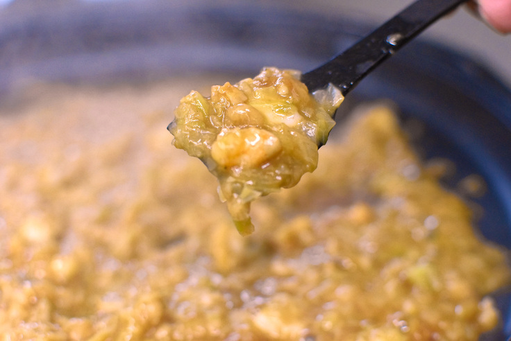 ⇒たっぷりの焼豚とチーズがもんじゃ全体に広がります。