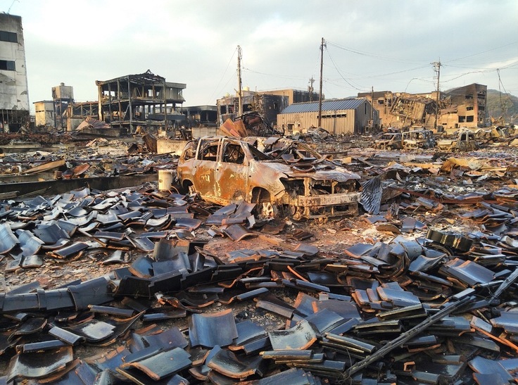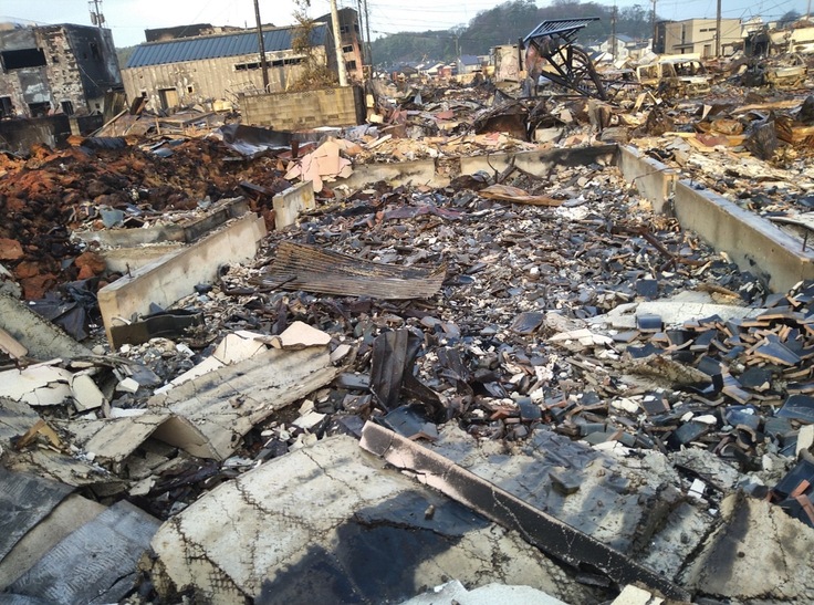父は近くで火災を見ているようだったので、私は急いで夜道を歩いて向かいました。歩いて行くと、初めて町が大変なことになっていると分かりました。瓦礫で埋め尽くされて道路かどうか分からない道を1時間くらいかけて進み何とか到着すると、そこはこの世と思えない火の海と、懸命に消化活動をする消防士さん達の姿がありました。