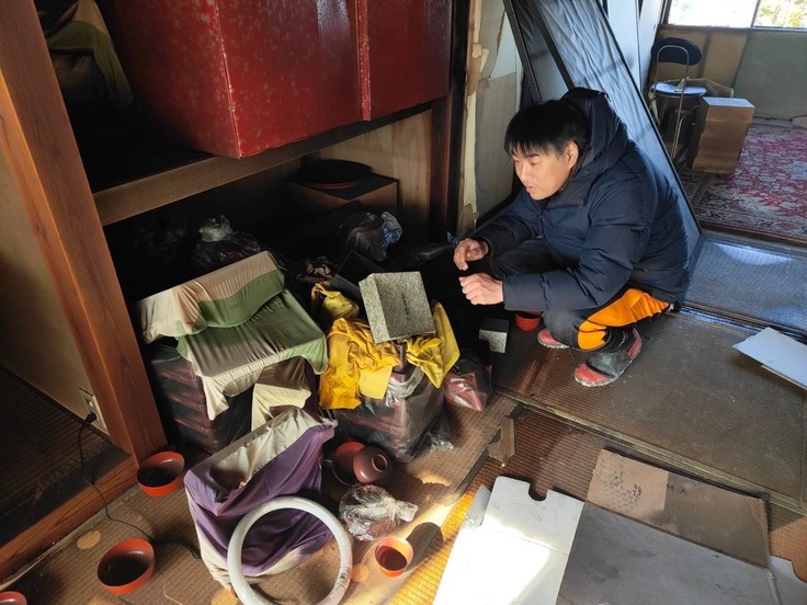 今回の震災による火災では、店舗、自宅、倉庫、土蔵、工房、営業車など、敷地内は全焼しました。店舗の外観は火災に耐えたものの、1階にあったお椀などの日用品から茶道具等の美術品、土蔵や倉庫に保管してあった大量の塗り物や漆、作業場にあった輪島塗の工程に欠かせない各種の道具、漆を乾かす塗師風呂、自宅にあったお客様情報や売上台帳などの事務書類も焼失しました。