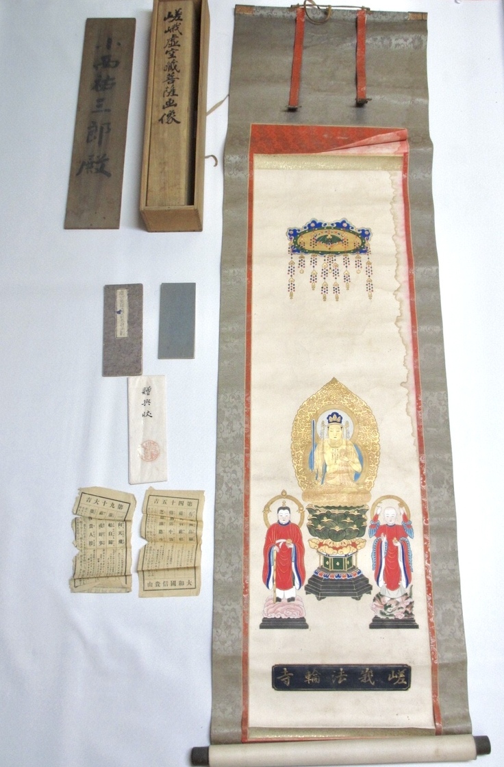 ↑当店に伝わる大正時代の掛け軸。漆器業・工芸技術の守護仏である虚空蔵菩薩が描かれています。先祖が京都法輪寺で寄進したお礼にお寺から頂いたもの。漆の神様が「諦めないで」と言ってくれたようでした。