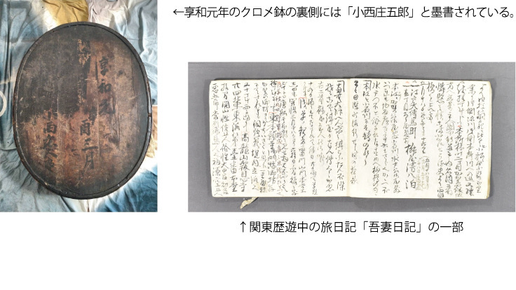 椀講を始めた二代目庄五郎(平蔵)は、関東を歴遊した際の「吾妻日記」、関西を旅した際の「西遊記」などの旅日記を遺した文筆家でもありました。また、五代目庄五郎(祐三郎)は書と俳句に長じ、俳諧関係の貴重な史料を多数遺しています。