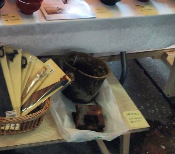 大盛況に終わった第1回出張輪島朝市。私たちの店舗では商品の他にも、火災のことをお伝えしようと、店舗跡から持ってきたものを展示しました。店舗1階から持ってきたのは、穴あけパンチなどです。火災跡には、木製漆器はもちろん何も残らず、残っていたのは金属・陶磁器類でした。