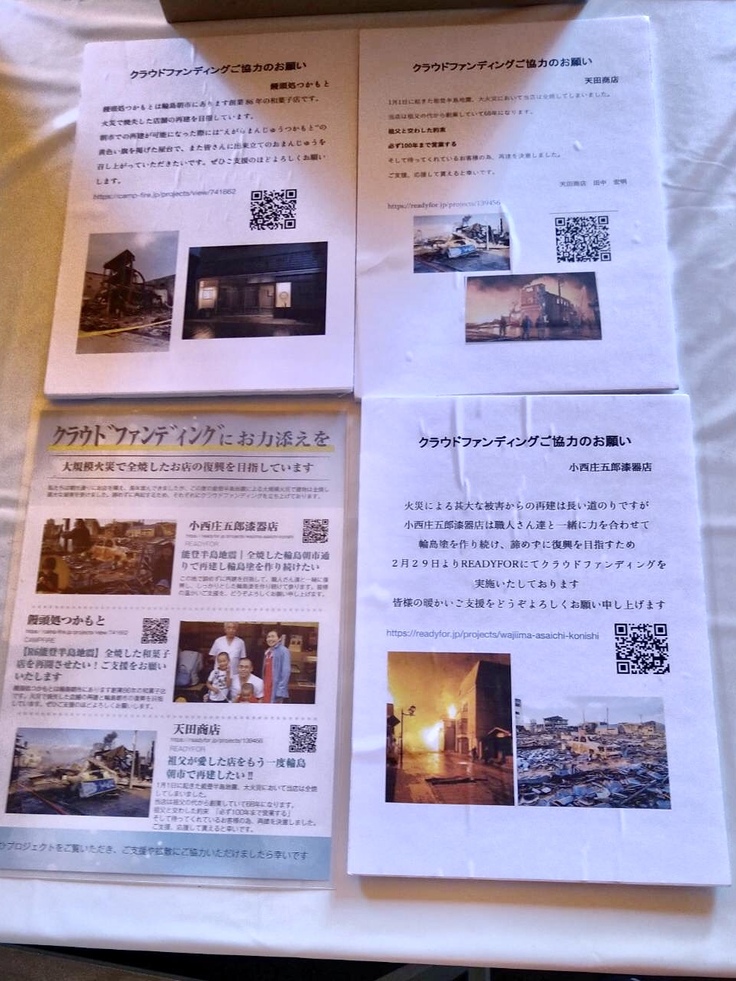 クラウドファンディングのチラシには、今回の出張輪島朝市に出店できず、同じく朝市通りでクラウドファンディングに挑戦中の「饅頭処つかもと」さんと「天田商店」さんのおふたりも一緒に掲載させていただきました。