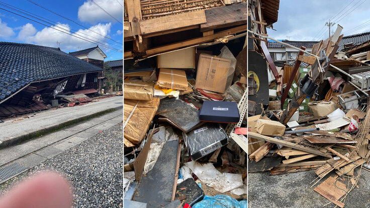 この度、能登半島地震発生により、輪島本店・工房・自宅が上記写真のように全壊し被災しました。当工房の職人たちは今も避難所生活や2次避難で金沢市へ移ったり、中にはビニールハウスでの生活を余儀なくされています。私自身は、倒壊した家の柱の下敷きになり右腕を骨折しました。命が助かったことは本当に幸いでした。まず私たちがやるべきことは、この倒壊した会社を建て直し、輪島塗の事業を再建をする事です。そして、魅力的な輪島市の再建に寄与したいです。