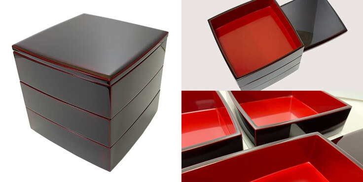 溜塗(ためぬり)。赤の上に黒の漆を塗り重ねる技法で作りました。ワイン色が美しいのが特徴です。縦18.5cm×横18.5cm×高さ17cm。