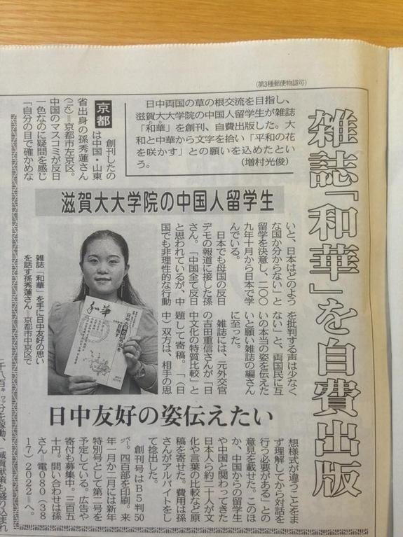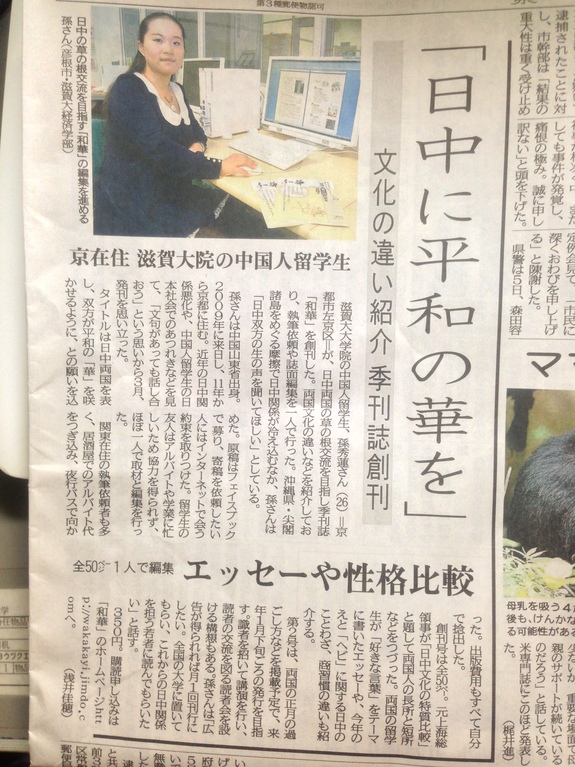 「和華」は2013年10月により私のアルバイし代で創刊してから、Facebookにて多くのご好評につき、さらに中日新聞、京都新聞、読売新聞、東京新聞などマスコミに大きく報道され、注目を集めました。
