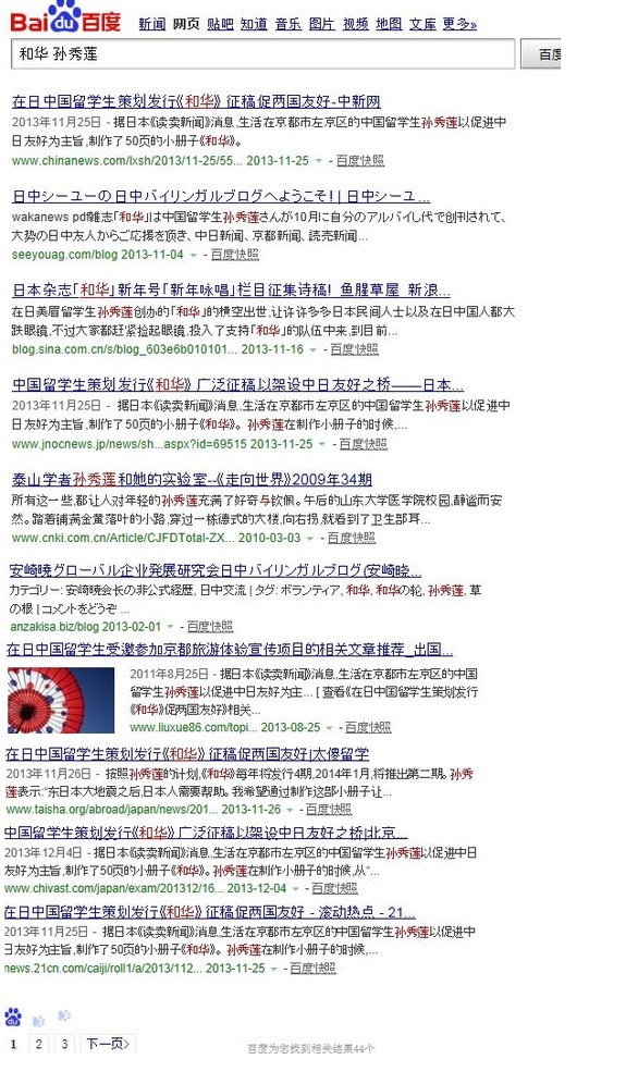 今日和華ボランティアチームメンバーの日中比隣さんは、中国百度サイトで検索してみたら、和華に関する中国語の記事がなんと3ページ、計40近く出てきました。