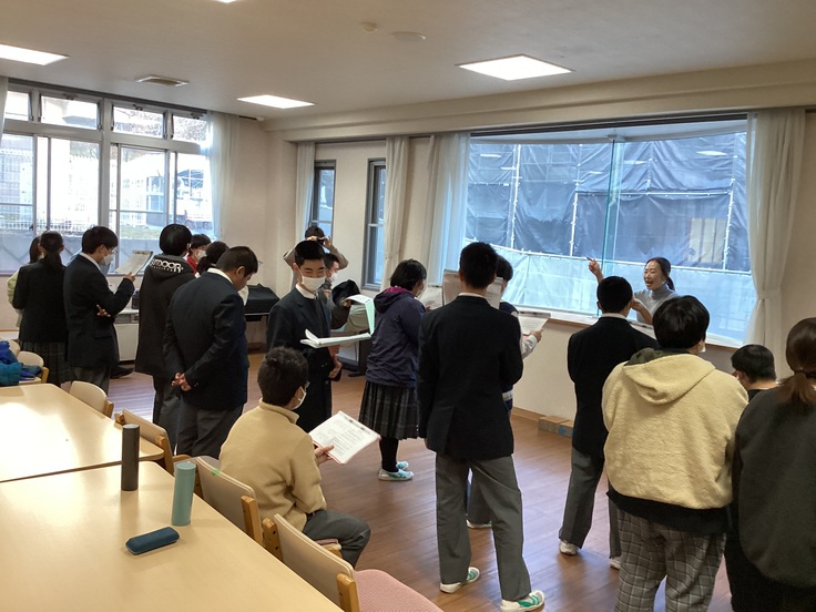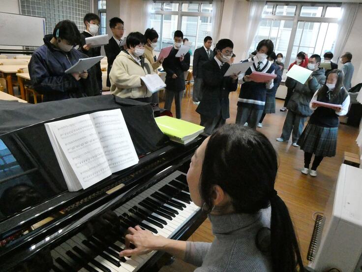 音楽の授業では、様々なジャンルの曲を歌ったり、鑑賞しています。音楽は、豊かな情操を育み、芸術を愛好することのできる心豊かな人間を育てます。現在、ピアノはステージ上にあり、生徒との距離が遠いため、マイクを使用したり、階段を上り下りして指導しています。