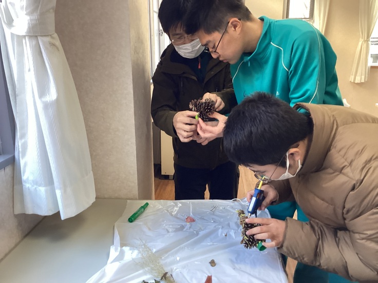 美術の授業では、「廃材や自然物を活用したアート」をテーマに美術教育を行っています。本来ゴミとして捨てられてしまう廃材や、乾燥させた落ち葉や花、自然石などを活用して、自然にやさしい芸術活動を行っています。新しい発想や、試行錯誤、自然とのふれあいなど、材料集めの段階から、すでにものづくりが始まっているという気付きを与える様に心がけています。