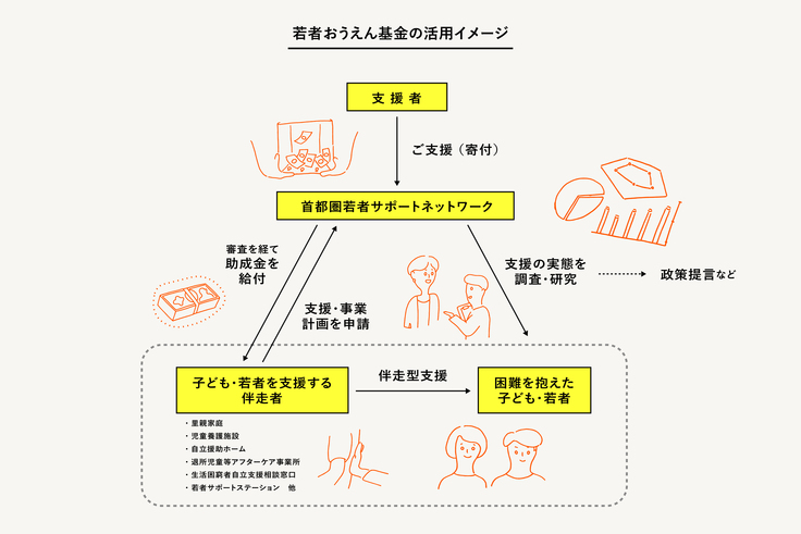 若者おうえん基金では、皆さまから広くご支援を募り、集まったお金を助成金として伴走者たちへ給付し、子ども・若者たちの支援に役立てています。