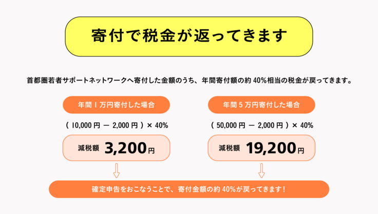 ※首都圏若者サポートネットワークへの寄付の受け皿となる公益社団法人ユニバーサル志縁センターは平成31年4月1日(認定日)、内閣総理大臣より「公益社団法人」としての認定を受けましたので、ご寄付には、特定公益増進法人に対する寄附金としての税法上の優遇措置が適用され、所得税(個人)、法人税(法人)の損金算入限度額の特例が受けられます。