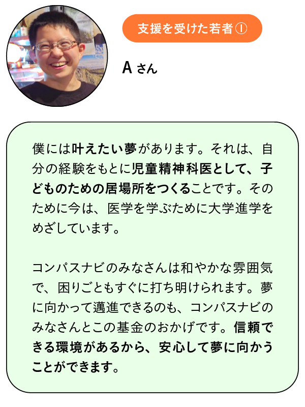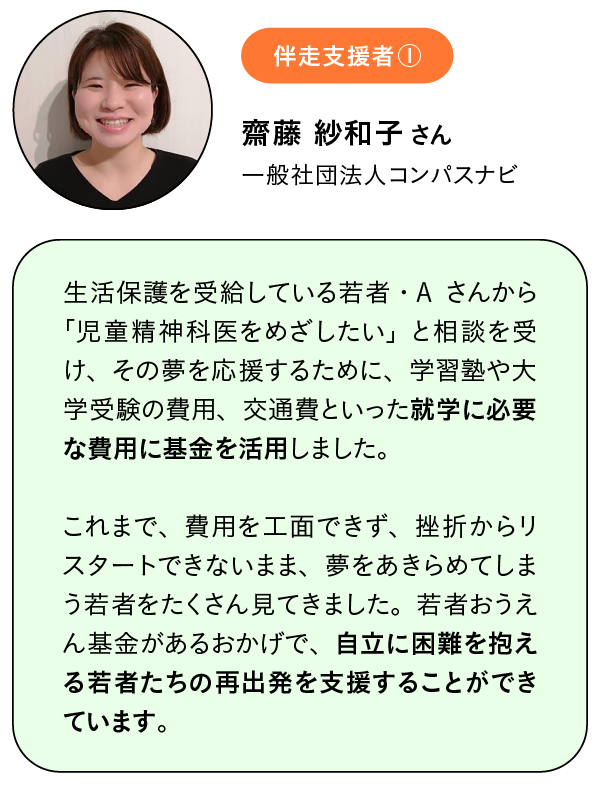 若者おうえん基金は、困難な状況にある若者があきらめなくていい社会をつくる力強いサポートです。あなたが生きている社会には真剣にあなたの未来を一緒に考えてくれる大人がたくさんいるんだよ、だからあきらめなくていいよ、というメッセージが今助けが必要な若者たちに届くといいなと思います。