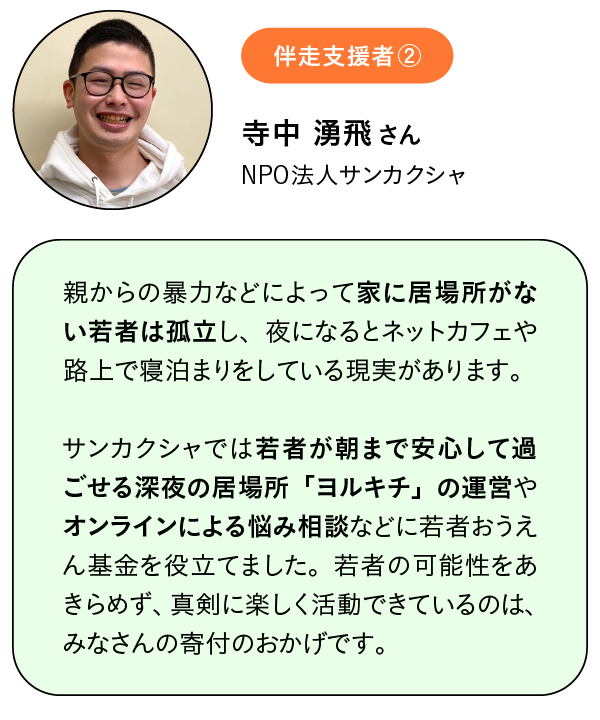 そんな若者たちを支援のプロと共にサポートし、彼らが将来をあきらめずに生きていける社会づくりに取り組む基金が、今回ご寄付を募る「若者おうえん基金」です。