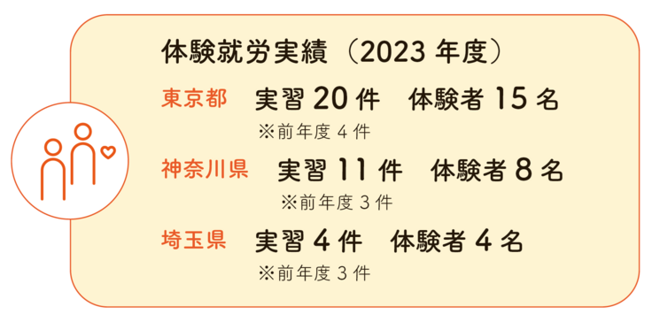 東京都では、体験就労の対象を自立援助ホーム入所者だけでなく、アフターケア事業所が支援している若者や里親家庭で養育されている若者へも広げました。また、2022 年度からスタートした埼玉県・神奈川県でのプログラム展開も軌道にのり、1都2 県での体験実習事例が格段に増加しました。